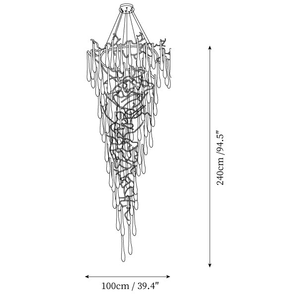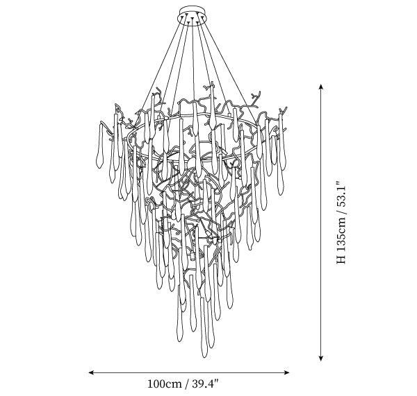 Inspired by Winter water drops. both by its element of inspiration and by its inherent association with our identity, expressing a strong connection to our main inspiration source, nature. The brass structure expands in entangled branches that lead to floating glass pieces, a characteristic that concedes an airy touch together with its delicate and elegant look, concepts visible in the smallest detail of the glass drops. Through several chromatic choices and design options, the Aqua Collection presents itself as an exquisite nature-inspired piece, perfect for any concept.